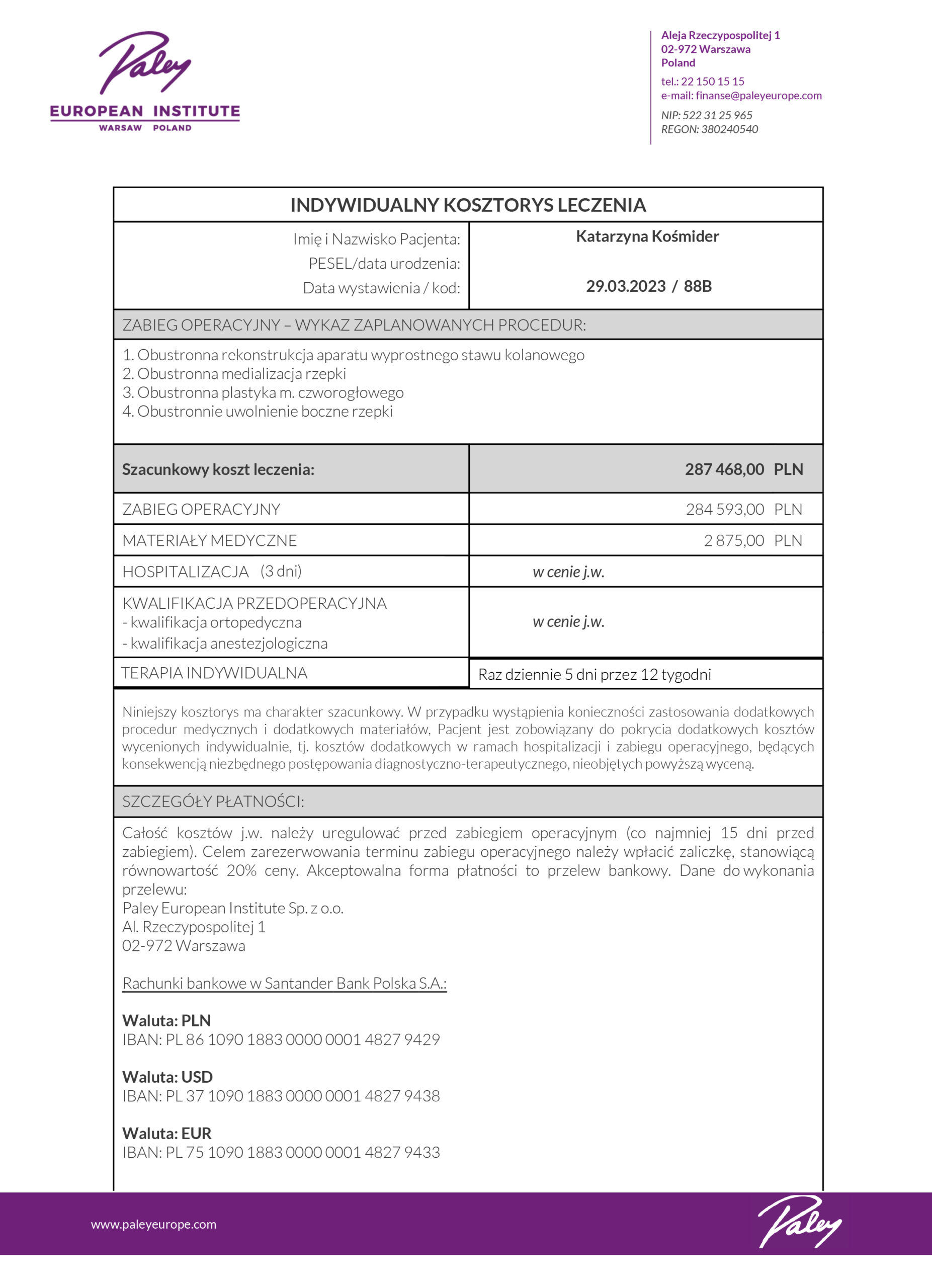 03.11.2022 r. Otrzymaliśmy kosztorys kolejnej operacji nóg Kasi, niestety jest on dużo wyższy niż się spodziewaliśmy i wynosi 332 492,40 zł. Ma być to finalna operacja kończyn dolnych. W jej trakcie dr Feldman przeprowadzi obustronną plastykę więzadła rzepki, plastykę mięśnia czworogłowego metodą JUDET, usunie implanty z kości udowych, a także podejmie się ich skrócenia. Wszystko po to, aby Kasia mogła pewnie kroczyć na własnych nogach! Operacja została wyznaczona na wrzesień 2023 r. Do tego czasu musimy uzbierać brakującą kwotę 200 000 zł. Kasia pokonała już tak długą drogę, dzięki Wam osiągnęła tak wiele, nie pozostawiajcie jej samej na ostatniej prostej!