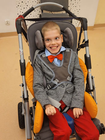 Synek ma teraz 12 lat, nie siedzi bez wsparcia, nie chodzi, nie zmienia samodzielnie pozycji, nie może utrzymać głowy. Tymuś nie potrafi komunikować się werbalnie, nie ma wypracowanych gestów i nie posługuje się komunikacją alternatywną. Jest całkowicie zależny od pomocy innych, nie zgłasza potrzeb fizjologicznych. Ze względu na mocny szczękościsk muszę karmić go specjalną plastikową łyżeczką. Mój chłopiec jest bardzo pogodnym i radosnym dzieckiem, chociaż często na jego twarzy i w jego ciele widać ogromne napięcie - to wyraz bólu i lęku. Synek bardzo nie lubi hałasu, jest wrażliwy na dźwięki, czasami zdarza się, że emocje powodują, że nie może złapać oddechu. Jako jego mama jestem jego barometrem i odgaduję jego emocje, ludzie z zewnątrz jednak wciąż mają z tym kłopot…